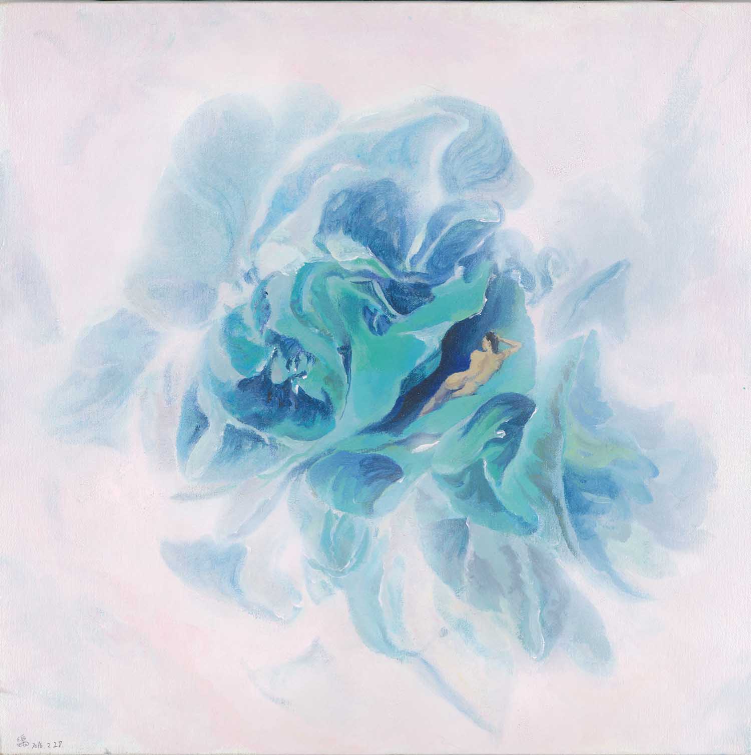 “人造天堂”最初来源于波德莱尔描写印度大麻的同名文集。“人造天堂”被波德莱尔用来描绘大麻和鸦片对人的作用,人们在吸食瘾品后仿佛进入到了一个忘我的天堂,但这个天堂不是上帝赋予的,是人为的自我麻痹产生的。孙晓乐将其概念延伸出来,用于比喻人类通过发达的技术为自己创造的当代生活环境。在近期一直持续的以草本植物为主题的系列作品中,孙晓乐试图把中国传统绘画里的”气“和西方传统绘画里的”光“相结合,使得强烈的不自然的人造光在画面里产生了一种”光气“朦胧的效果,描绘出了一个光洁,明亮,无力,迷醉的世界,是对当下人们生活质感的隐喻。