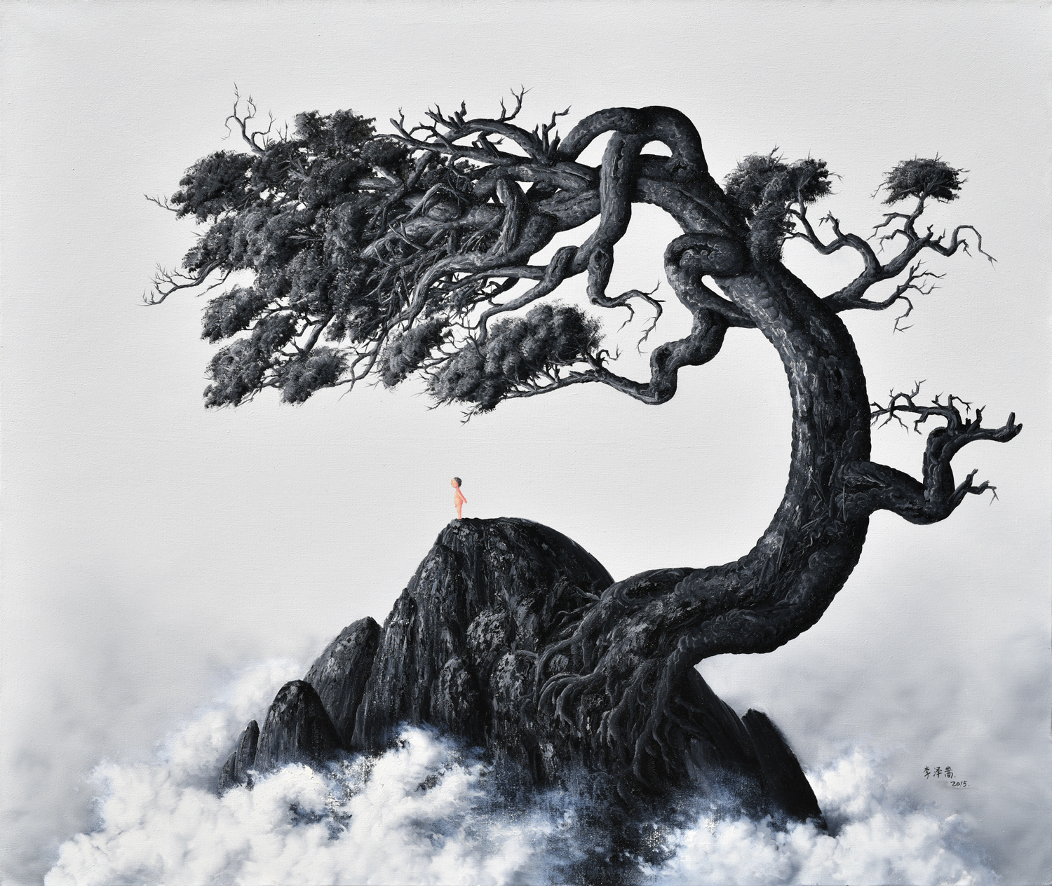 者在画面处理上使用简单而经典的黑,白,灰色,并以中国画的图式和中国话的白话语言环境来表达他的作品。作品中的“小人”外在寓意现实生活中人的孤独,脆弱和无助之感,而内在表现了人的情感和精神是有着无限大的力量与境界的,就如大自然一样。在李泽嵩的世界里可以体会到幽默、清雅、安宁的精神境界以及人在自然中的孤独与陪伴并存的情绪……