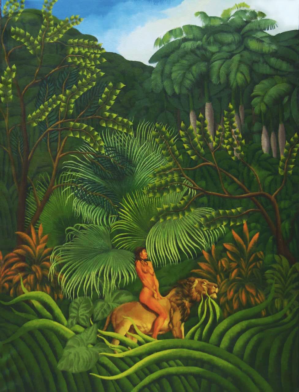 森林女神骑着狮王穿梭在鸟语花香美丽的丛林中,悠然自得快乐的歌唱……